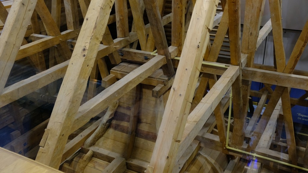 Zur Hauptausstellung geht man eine Treppe nach unten. Und da haben wir Euch ja unter anderem die tolle nachgebaute Decke der Synagoge von Gwoździec gezeigt. Nun, im Erdgeschoss sieht man „von außen“ auf die Dachkonstruktion.