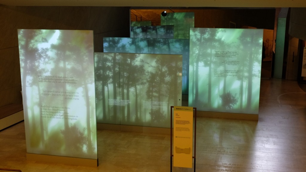 Die Ausstellung beginnt mit einem „Wald“. Hier wird erzählt, dass die Juden aus dem westlichen Europa in die polnischen Landstriche kamen und dort Vögel singen hörten: Po-lin, was „ruh dich hier aus“ bedeutet.