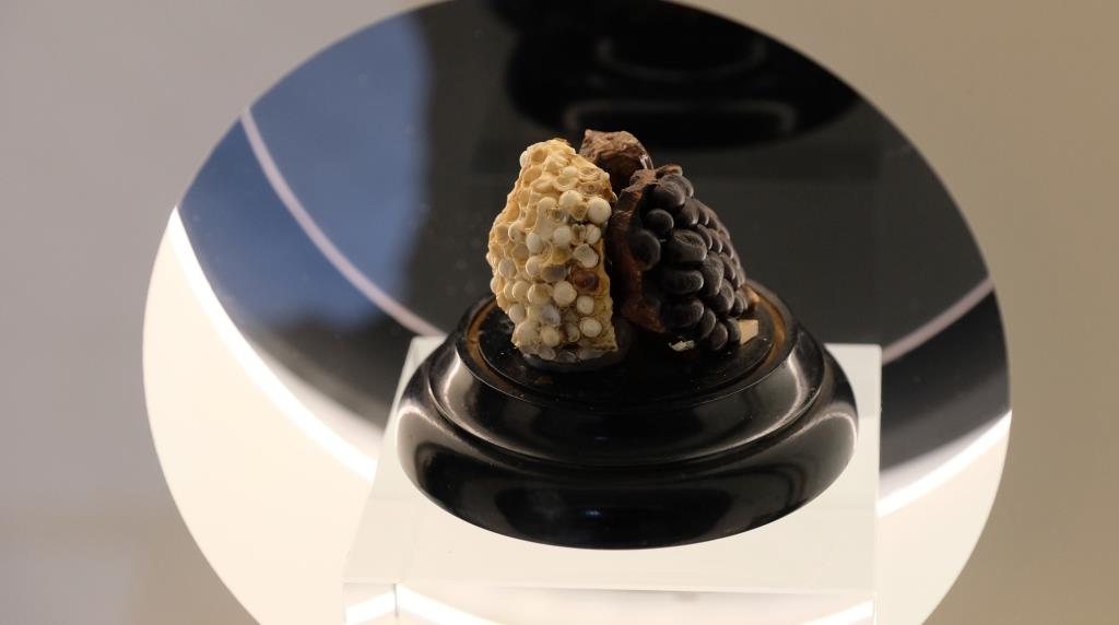 Und hier: Pisolith. Das kann sich in den sprudelnden Quellen ablagern, wenn die richtigen Stoffe im Wasser zu finden sind.