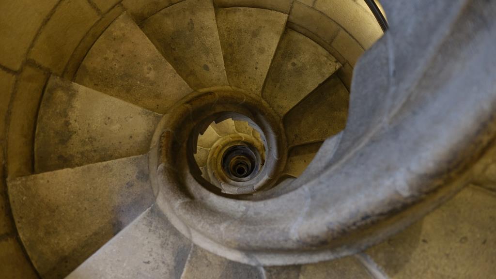 Dann geht es die schöne Wendeltreppe hinunter.