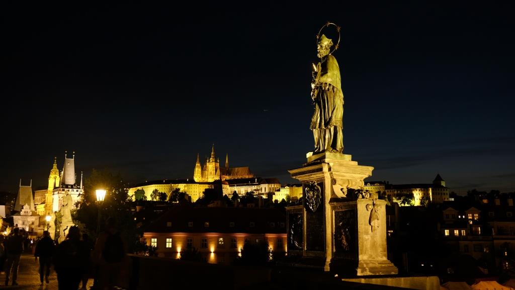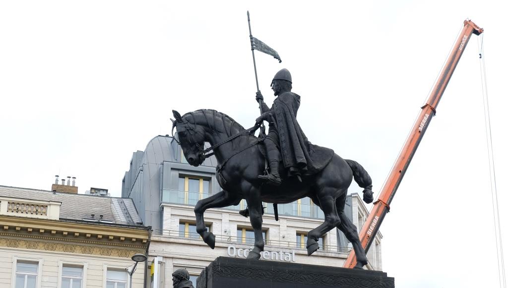 Nach dem Essen sind wir dann ein Stück die Straße hoch, da sitzt der Heilige Wenzeslaus richtig herum auf dem Pferd: