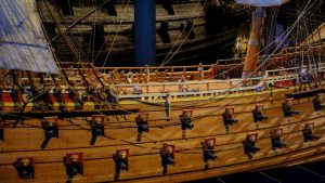 Eine Menge Kanonen hatte der König geordert – für zwei Kanonendecks. Nicht nur, dass solch ein Schiff in Schweden bis dahin noch nie gebaut worden war, es war problematisch, weil die Kanonen natürlich für viel Gewicht sorgten, das recht weit oben im Schiff die Stabilität erschwerte. Und außerdem, weil das Schiff auf die Weise nicht tiefer als bis knapp zu den unteren Stückpforten im Wasser liegen durfte. Für die Steine, die als Ballast unten in den Kiel kamen, war recht wenig Raum ….