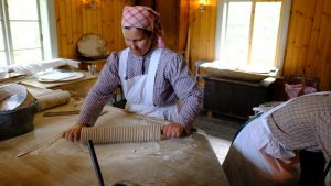 Here we got to watch how thin flat bread was made. Rye flour, salt and water. A dough which is terribly difficult to handle.