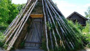 Hier seht Ihr jetzt eine Unterkunft der Lappen, aus Torf und Birke. In der Mitte war die Feuerstelle, das Rauchloch im Dach konnte man bei schlechtem Wetter verschließen. – Und der Türgriff ist besonders schön, findet Ihr nicht?
