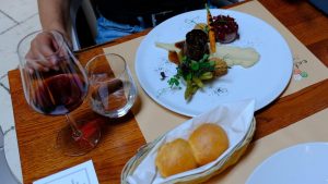 And you remember that atrium with a glass ceiling and wine shelves? There they also have a table with two chairs. That is part of the restaurant which really is situated in the room around the corner. Torben and I had dinner there. We had the whole room to ourselves, and the waiter was just wonderful and took perfect care of us. – Oh, and it was very yummy on top!