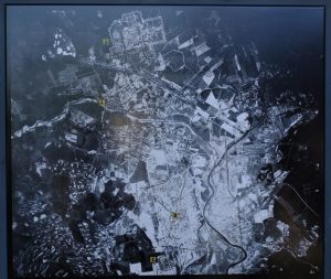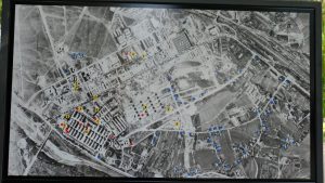 To conceal what was happening in Auschwitz and to reserve further land for future industrial and agricultural activity, in 1940 the SS declared an area of 40 square kilometers around Auschwitz and Birkenau an „Interessengebiet“, or special interest zone. Most of the Poles living in the area were expelled in 1940 and 1941. – In the photo below, the blue squares show their houses.