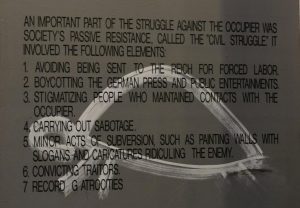 [Ein wichtiger Bestandteil des Kampfes gegen die Besetzer war der passive Widerstand der Bevölkerung, genannt der „Kampf der Bürger“. Er beinhaltete folgende Elemente: 1. Vermeiden, zur Zwangsarbeit in das Reich geschickt zu werden 2. Boykott der deutschen Presse und von öffentlichen Veranstaltungen 3. das Brandmarken von Leuten, die Kontakt mit den Besetzern hielten 4. Sabotage-Akte ausführen 5. kleinere Akte von Vandalismus, wie z. Bsp. Wände mit Sprüchen oder Karikaturen zu verzieren, die den Feind lächerlich machten 6. Verräter verurteilen 7. Gräueltaten aufzeichnen]