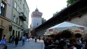 Pieces of the old town wall are still standing. The tower in the background houses the St. Florian’s Gate, the last remaining city gate.