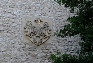 Am Turm sieht man auch das Wappenschild von Polen, den weißen Adler.