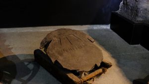 Here you see a „bochen“ of the early 14th century, a chunk of cast lead earmarked to be sold wholesale. The weight is 693kg, it has a diameter of 88cm and a maximum thickness of 19cm. At four spots, the slab was hit with an axe to form „beaks“ for easier transport. Three of those were cut off, probably to reach the desired weight.