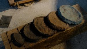 Reconstructed copper discs – with a weight of about 15kg, a diameter of approximately 30cm – and a quarter of a copper disc of the 14th century. In general such discs had a diameter of 20 to 40cm, the average weight was 20kg. They were only about 1 to 2cm high. Only at the edges there was a border of about 3,5cm. The disc fragments that were found in Krakow were made out of pure copper (~98%). The price for 50kg of copper in the first half of the 15th century was about 120 groschen.
