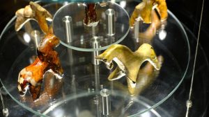 Next to hammer and anvil, the goldsmiths also used the technique of casting. For that, molten metal was poured into a stone or clay cast, and after cooling down, uneven spots were smoothed over and ornaments were added.