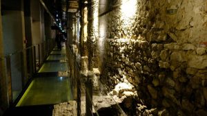 A cobbled pathway in the cross of the Boleslaw Stalls with a modeled gutter and visible ruts left by wagons. Laid in the early 14th century as the fourth subsequent paved layer of the pathway, it was partly removed at the end of that century during the demolition of the stalls.