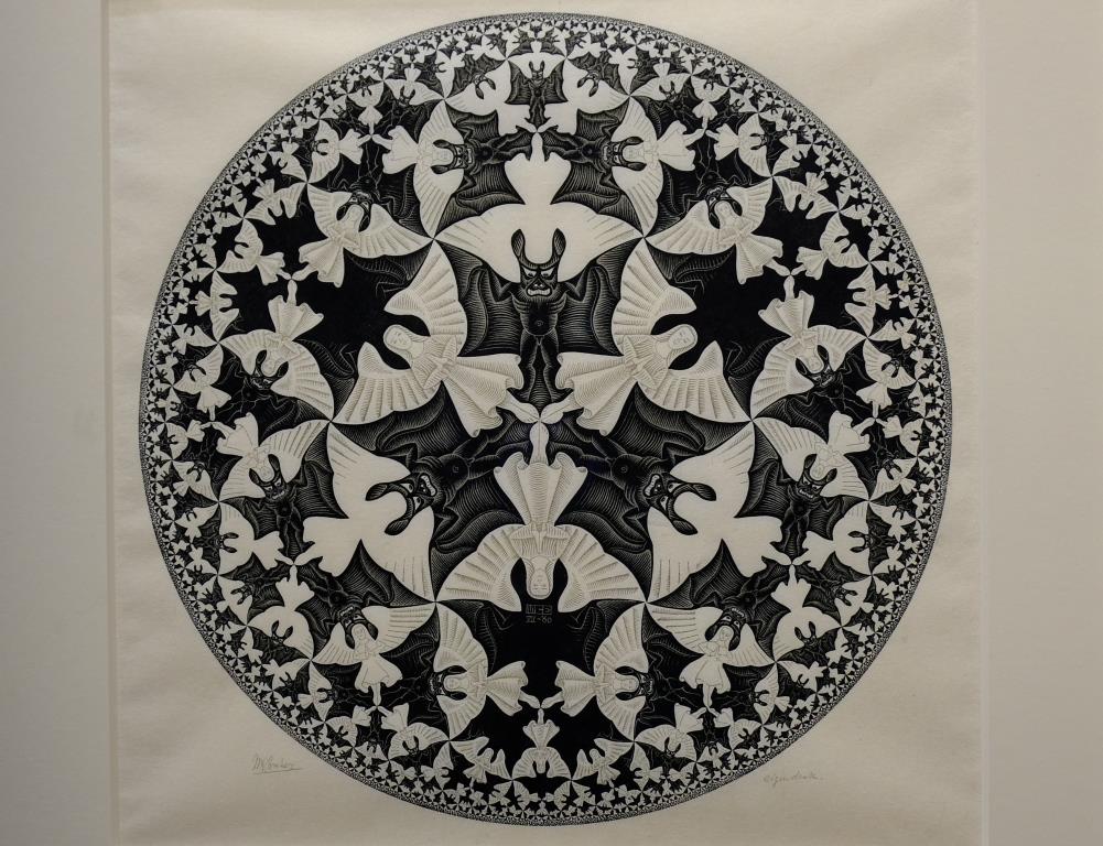 Dieser Holzschnitt von 1960 zeigt dann ein Motiv in dem Stil, für den Escher berühmt ist: Begrenzter Kreis IV (Himmel und Hölle)