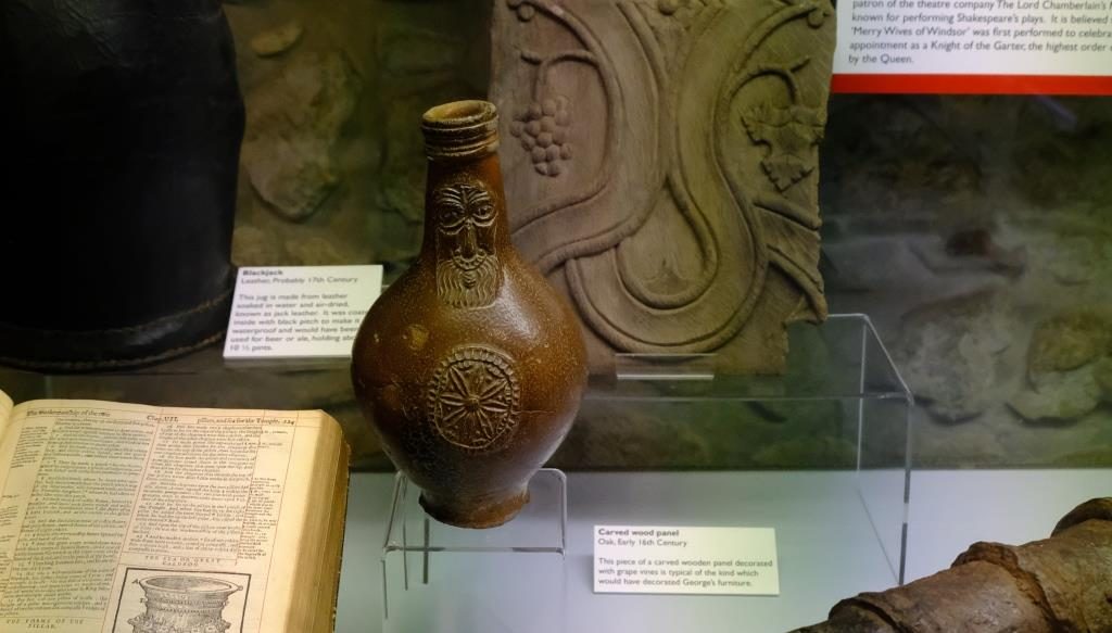 Als nächstes haben wir uns das kleine Museum angesehen. Hier habt Ihr ein „Bartmann Jug“ aus Steingut. Nach 1634 wurden diese Krüge oft Bellarmine genannt, um sich über den ungeliebten Kardinal Robert Bellarmine lustig zu machen.