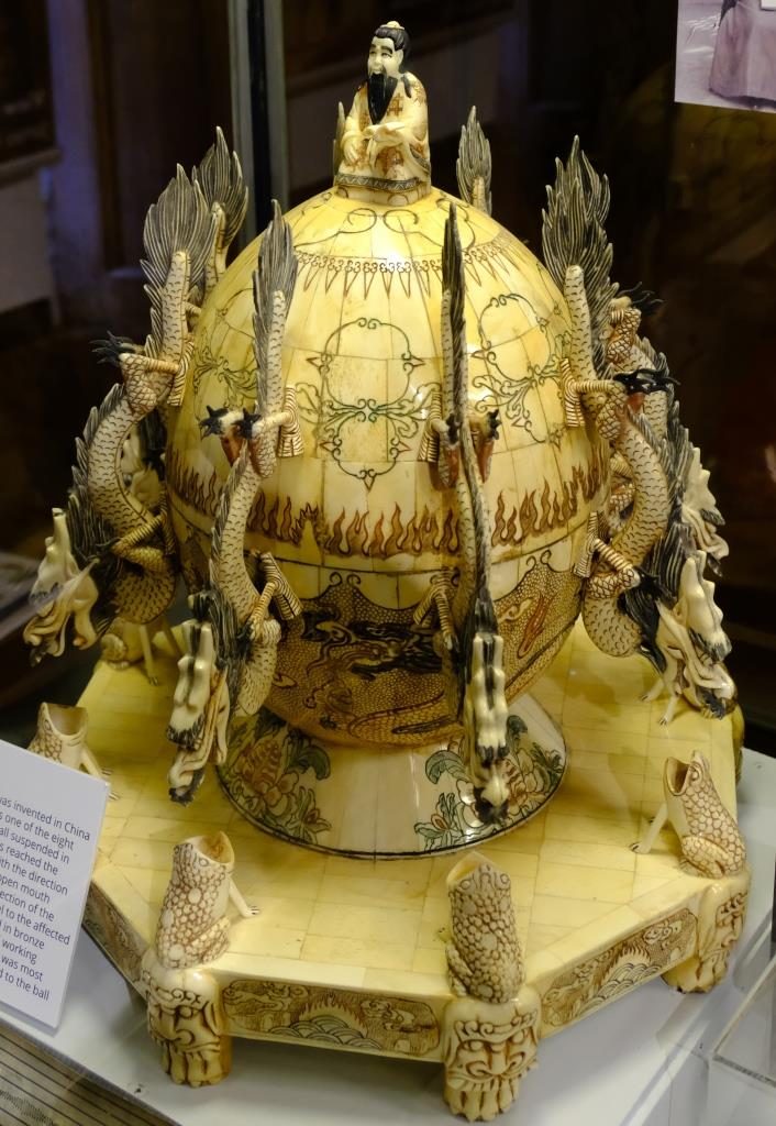 And here something really extraordinary: a seismoscope, invented by Zhand Heng in China, to detect earthquakes. The dragons are arranged according to the eight points of the compass. And when an earthquake wave reaches the seismoscope, the dragon spits a ball into the mouth of the toad beneath it.