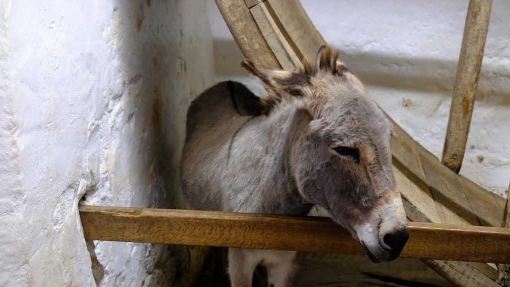 And why are there donkeys here? Well, they work here! The first time that it was mentioned that donkeys move the treadwheel to get water out of the 49m deep well, was 1696.