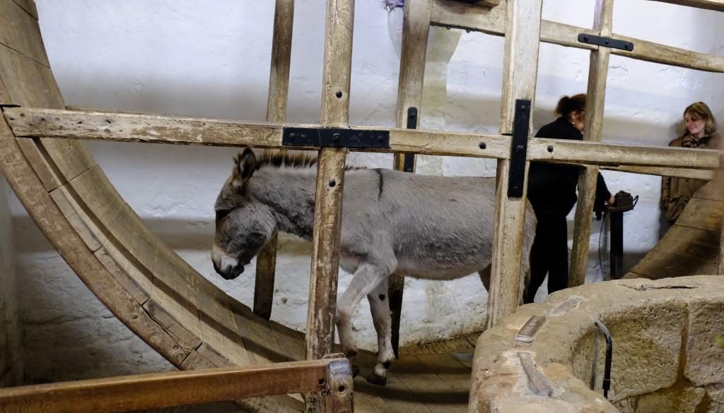 Und warum gibt es hier Esel? Na, die arbeiten hier! 1696 wurde das erste Mal erwähnt, dass Esel das Laufrad betätigten, um Wasser aus dem 49m tiefen Brunnen zu holen.