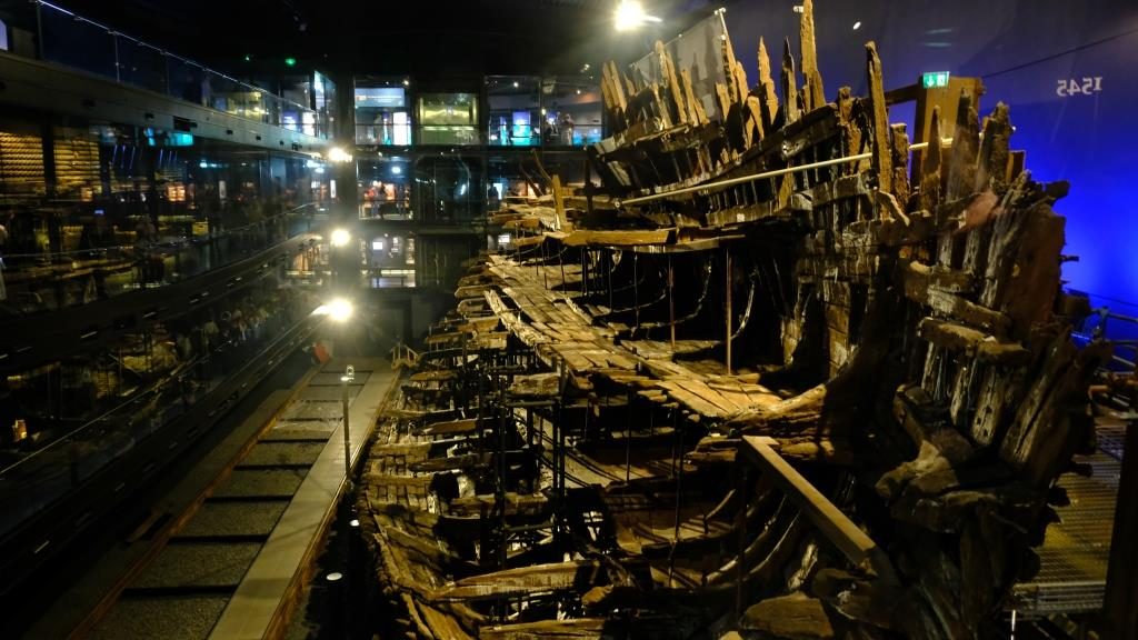 1545 the Mary Rose, Henry VIII’s flagship, sunk just off Portsmouth. 1982 that which remained of it, was raised from the seabed and displayed in a museum behind glass. And 2013 it was all moved to the new museum where since 2016 it can be seen without the protective glass cover. – And you can also smell the old wood!