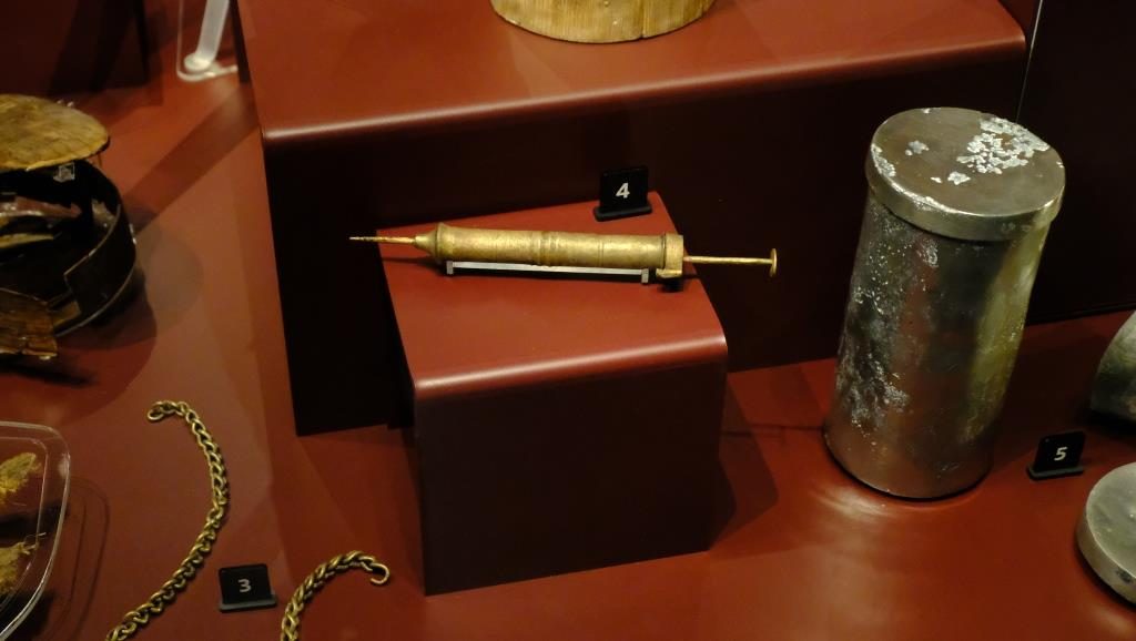Many very interesting items were found at the bottom of the sea, and are on display here. For example, a syringe for draining wounds.