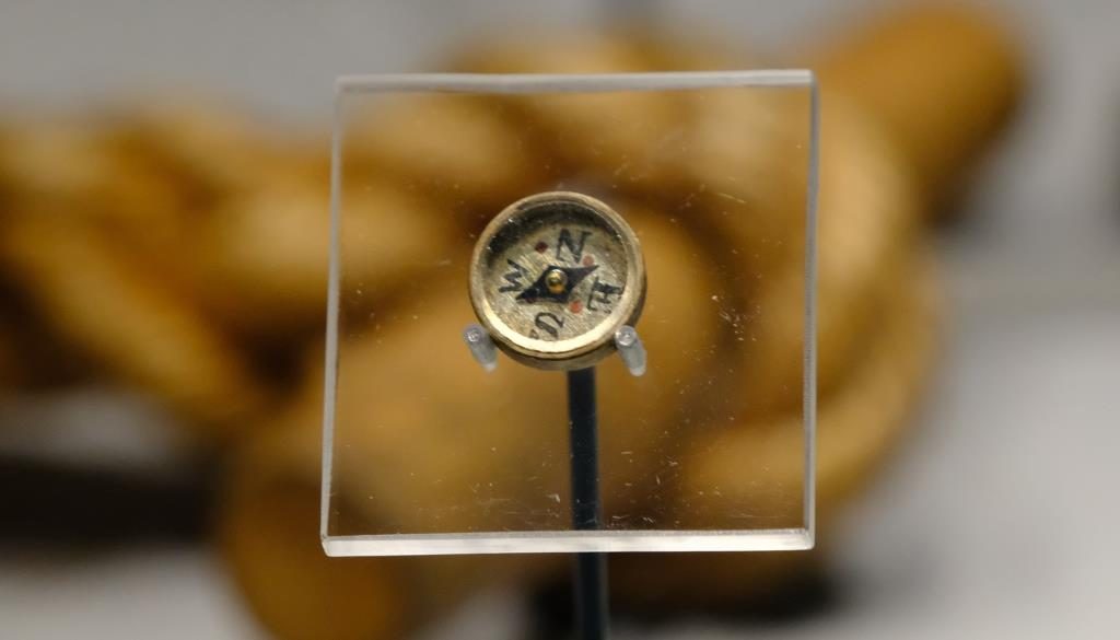 Hier seht Ihr einen Kompass, der in einem kleinen Knopf versteckt ist. Spezialkräfte, die in kleinen Gruppen im Feindgebiet operierten, hatten solche Ausrüstung.