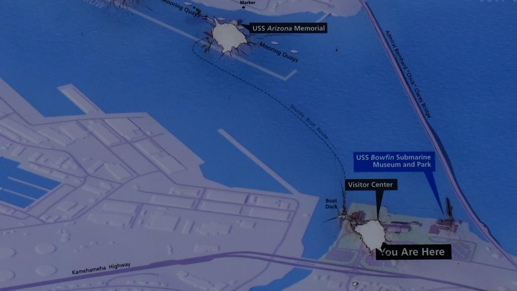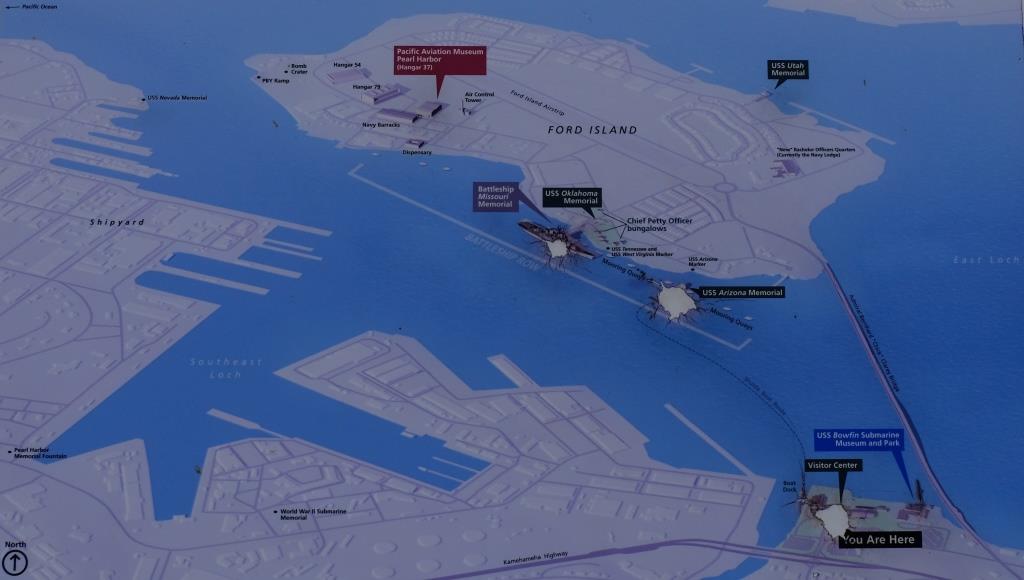 Bisher waren wir auf Oahu ja eigentlich immer nur auf der Durchreise, zu anderen Inseln oder nach Hause. Dieses Mal haben wir entschieden, einen ganzen Tag hier einzulegen, um Pearl Harbour zu besuchen. Da gibt es etliches zu sehen, und wir hatten uns geärgert, dass alles auf Ford Island an einem Sonntag für uns nicht zu erreichen ist – man muss eine Bustour buchen, die wird nur Montag, Mittwoch und Freitag angeboten. Wir hätten uns gern all das hier auf dem Plan angesehen.