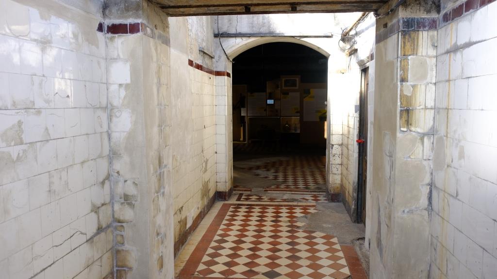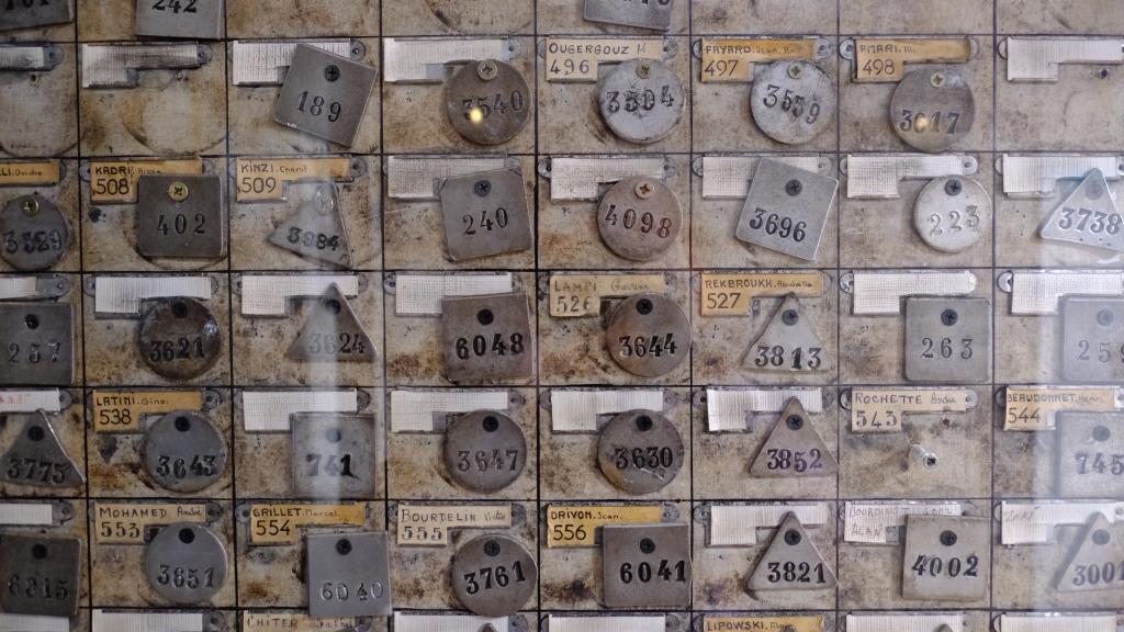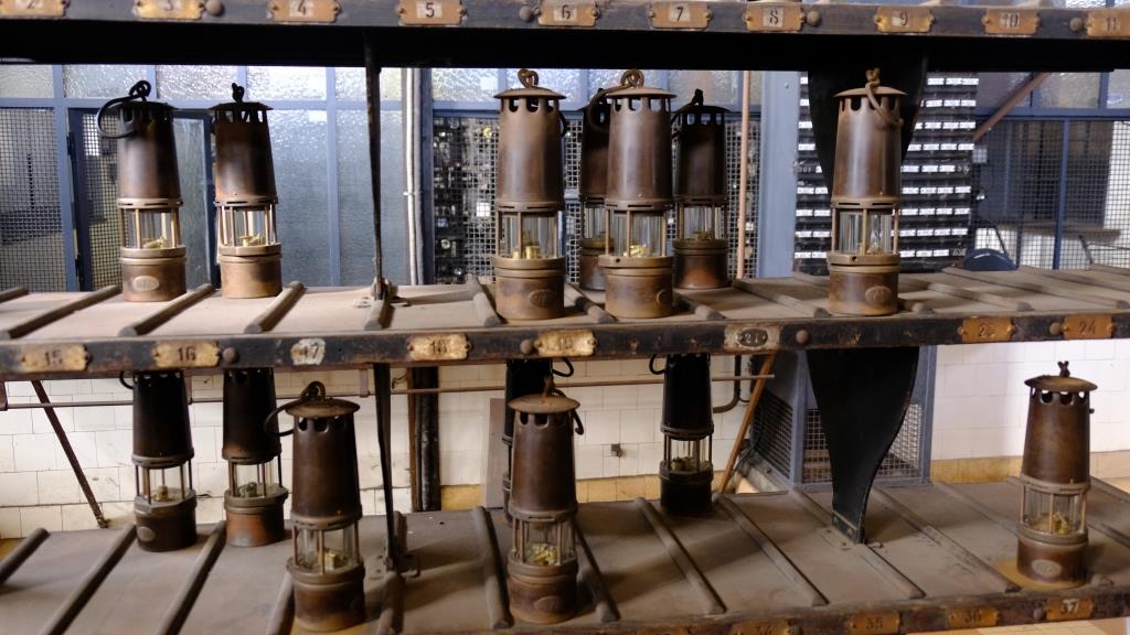 Und hier wurden die Pfandmarken platziert. Jeder Arbeiter hatte eine, die die gleiche Nummer zeigte, die auch auf seiner Lampe und seinem Korb stand. Die Form der Marken ergab sich aus der Schicht, zu der gearbeitet wurde: Rund für den Morgen, quadratisch für den Nachmittag und dreieckig für die Nachtschicht.