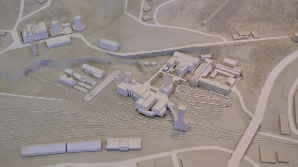 Hier ein Modell, das zeigt, wie die Anlage um 1955 herum aussah. Die Grube und zwei Abraumhalden nahmen ungefähr 20 Hektar ein. 1500 Minenarbeiter waren hier angestellt.