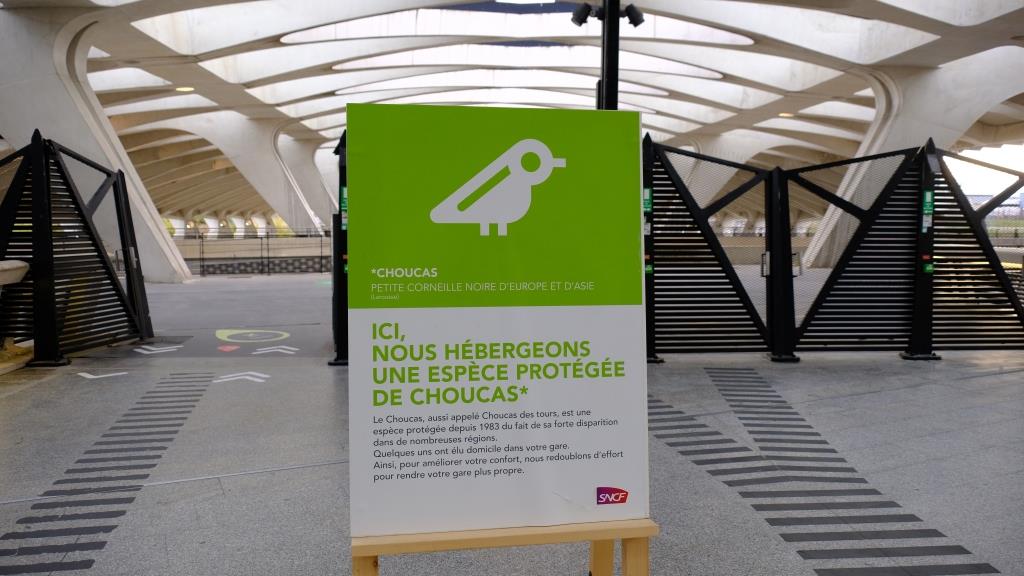 Hier steht ein Plakat, dass „choucas“ hier geschützt werden und Unterschlupf finden.