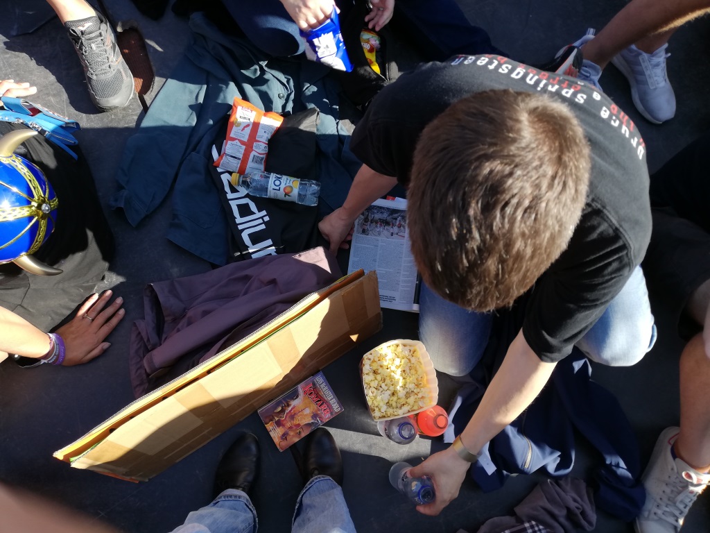 Kurz nach fünf waren wir drin und haben es uns gemütlich gemacht: Popcorn, Wasser, was zum Lesen.