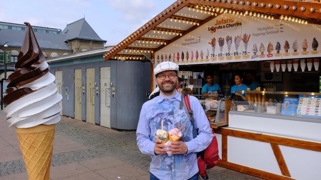Immerhin ist es schön warm, also kriegen wir ein Eis. Ich habe das erste Mal Lakritz-Eis probiert. Hm …