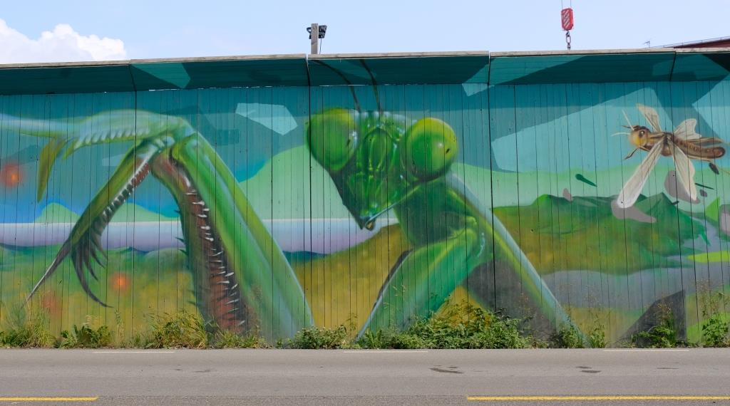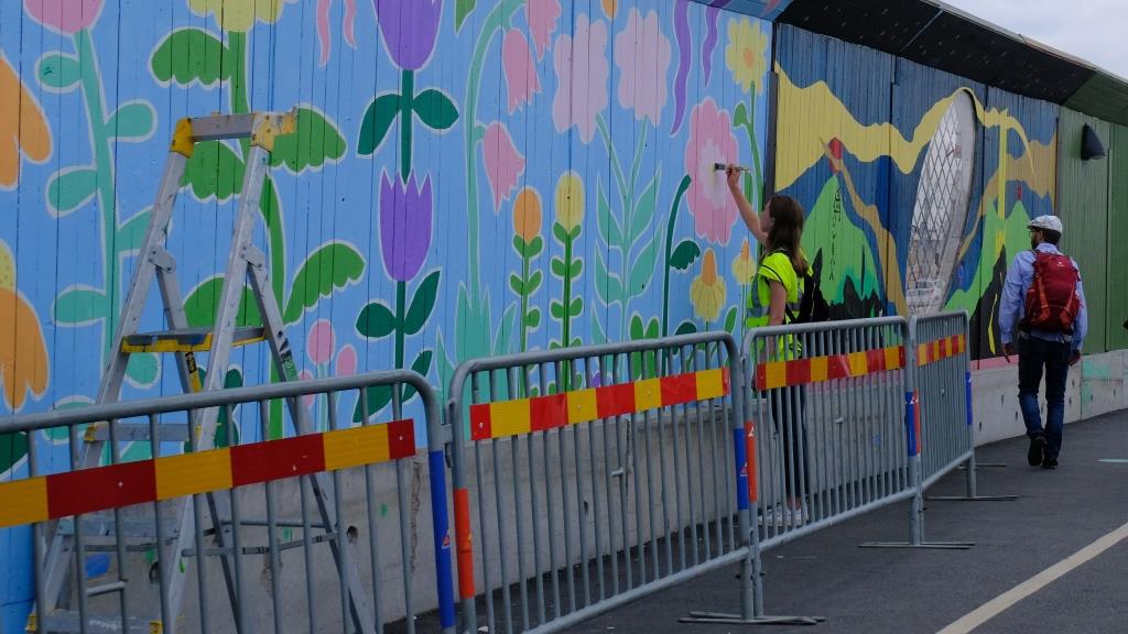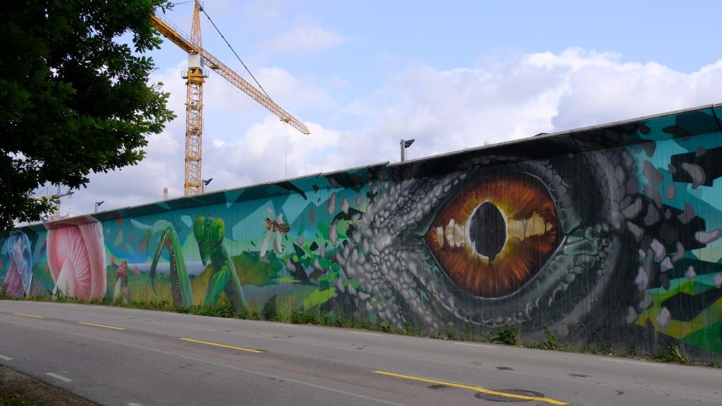 Ich hatte ja schon erwähnt, dass es in Göteborg viele bemalte Bauzäune zu sehen gibt. Hier haben wir jetzt eine Künstlerin in Aktion gesehen. Auch toll: In den Bretterwänden sind immer mal Gucklöcher vorgesehen, durch die man auf die Baustelle sehen kann (links von Torben gut zu erkennen).
