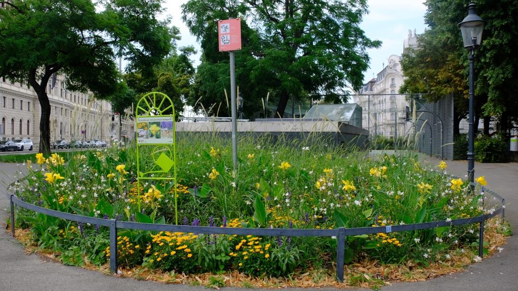 Wir sind wieder bei herrlichem Wetter und großer Hitze zu Fuß unterwegs. In Wien sind an allen möglichen Ecken Blumen und Büsche zu sehen. Dies hier sind die offiziellen Wiener Sommerblumen für dieses Jahr.