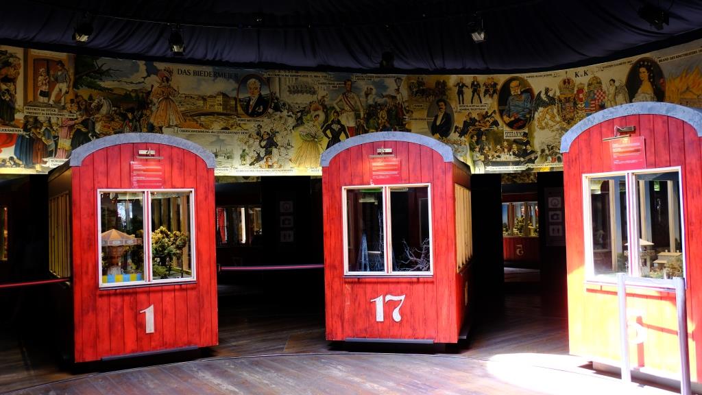 In einem Kreis sind “Waggons“ aufgestellt, die Szenen der Wiener Geschichte zeigen.