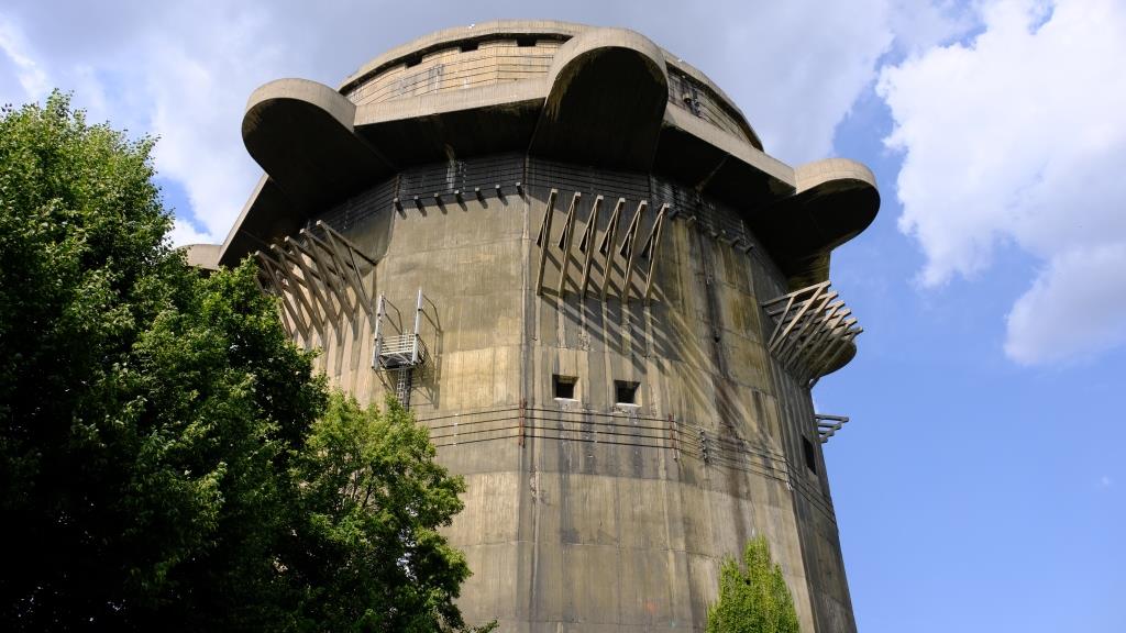 Im Augarten stehen zwei von sechs Wiener Flaktürmen. Der Gefechtsturm und hier dann der Leitturm. Gebaut wurden die Türme zwischen 1942 und 1945 von Zwangsarbeiter/-innen.