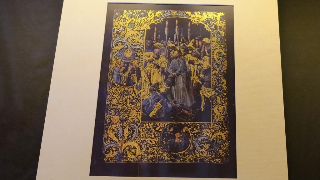 Und es gibt selbstverständlich auch besondere Exponate, die gezeigt werden: „Schwarzes Gebetbuch: Es haben sich weltweit nur sieben Handschriften erhalten, deren Pergament in schwarzer Farbe getränkt wurde, um so die Leuchtkraft von Gold, Silber und Deckfarben stärker zur Geltung zu bringen. Das Wiener Exemplar, von dem hier die Gefangennahme Christi gezeigt wird, ist der prachtvollste dieser Codices, die alle im 3. Viertel des 15. Jh.s in Brügge entstanden sind. Die Färbung hatte allerdings zur Folge, dass das Pergament immer spröder wurde und Umblättern mittlerweile zum Zerbrechen führen würde. Deshalb müssen die Seiten nun einzeln zwischen Acryl-Glasplatten montiert in einem Spezialtresor aufbewahrt werden.“