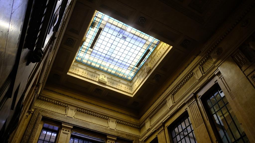 Innen gibt es sehr hohe Decken, auch mit großen Oberlichtern.