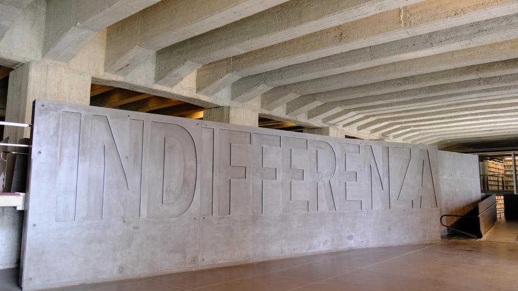 Now to an exhibition „below” the station: Memoriale della Shoah. At the entrance we are greeted by the word “indifference”.