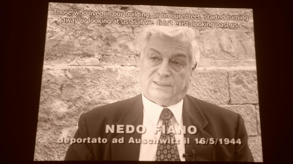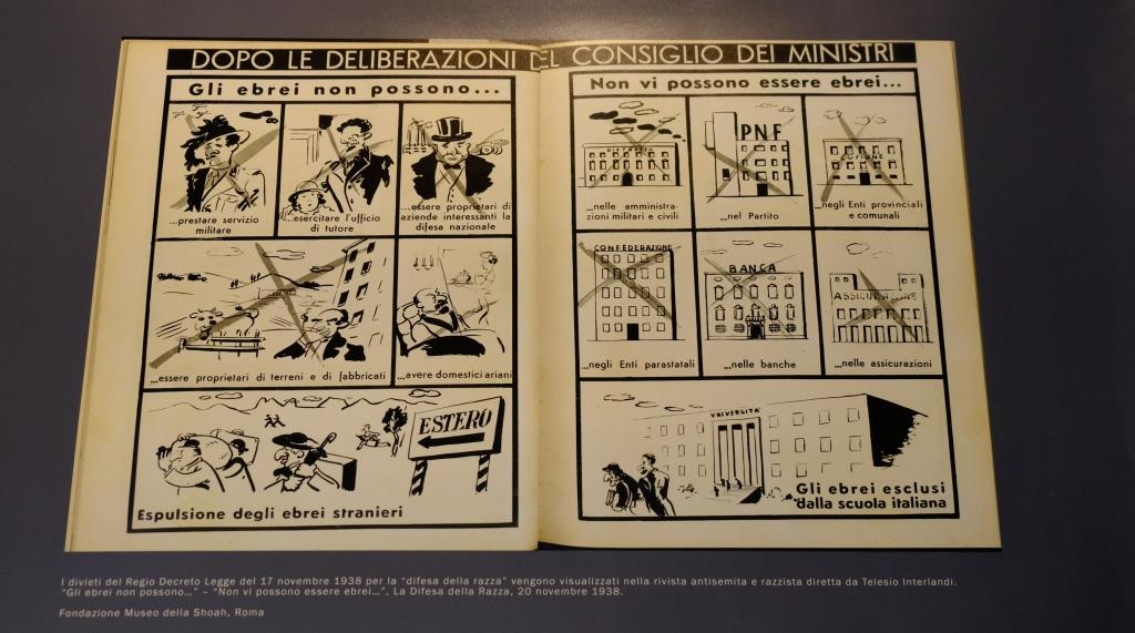 Überlebende haben berichtet, dass sie damals keine Ahnung hatten, dass sie mit einer Art Fahrstuhl fuhren. Man kann in der Ausstellung einige kurze Videos ansehen. Außerdem gibt es auch eine – italienische – Präsentation mit Fotos und Schriftstücken. Hier geht es um das Gesetz zum „Schutz der italienischen Rasse“ vom 17. November 1938, mit dem Juden umfangreichen Verboten unterworfen wurden.