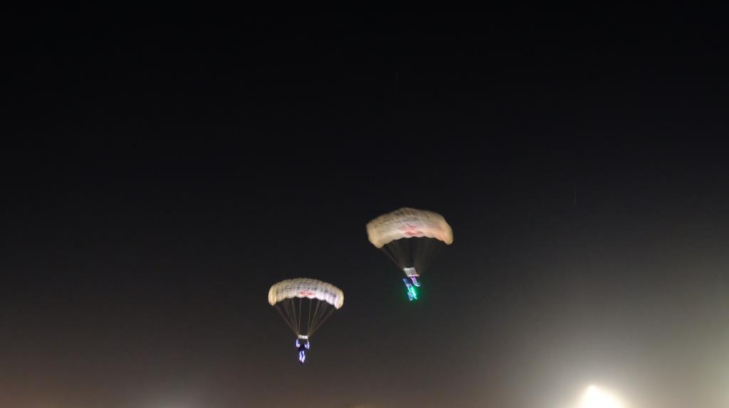 Aber weil die so lange brauchten, war das ganze Programm nicht zu halten, denn die Fallschirmspringer hätten nach den Gasballons nochmal springen sollen. Die kamen jetzt zwischendrin, und es war schon Nacht. Da hat man die beleuchteten Anzüge gut gesehen … aber die Kamera tat sich schwer.