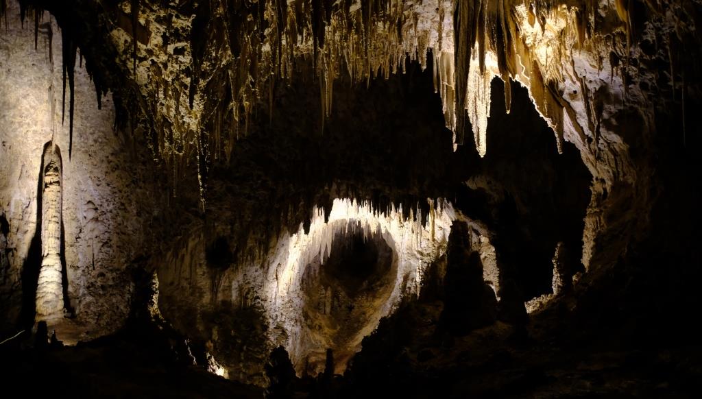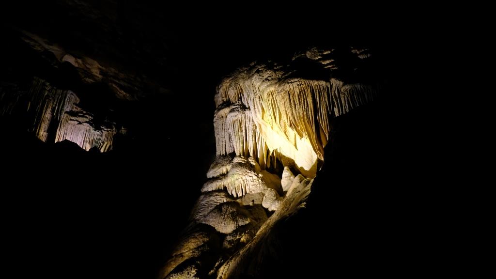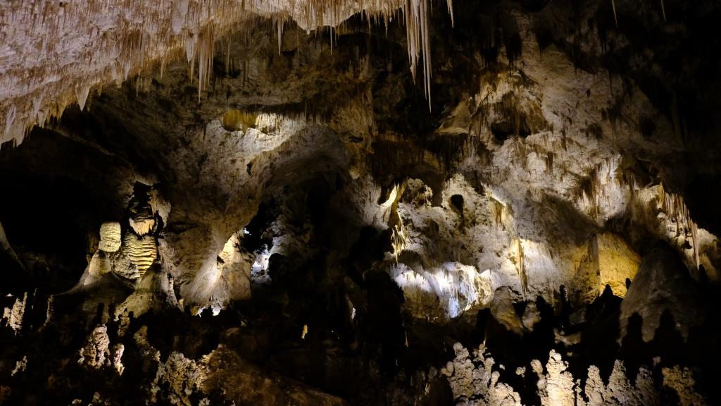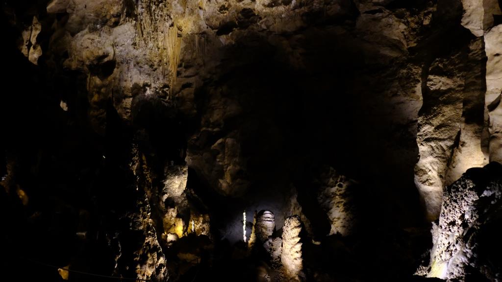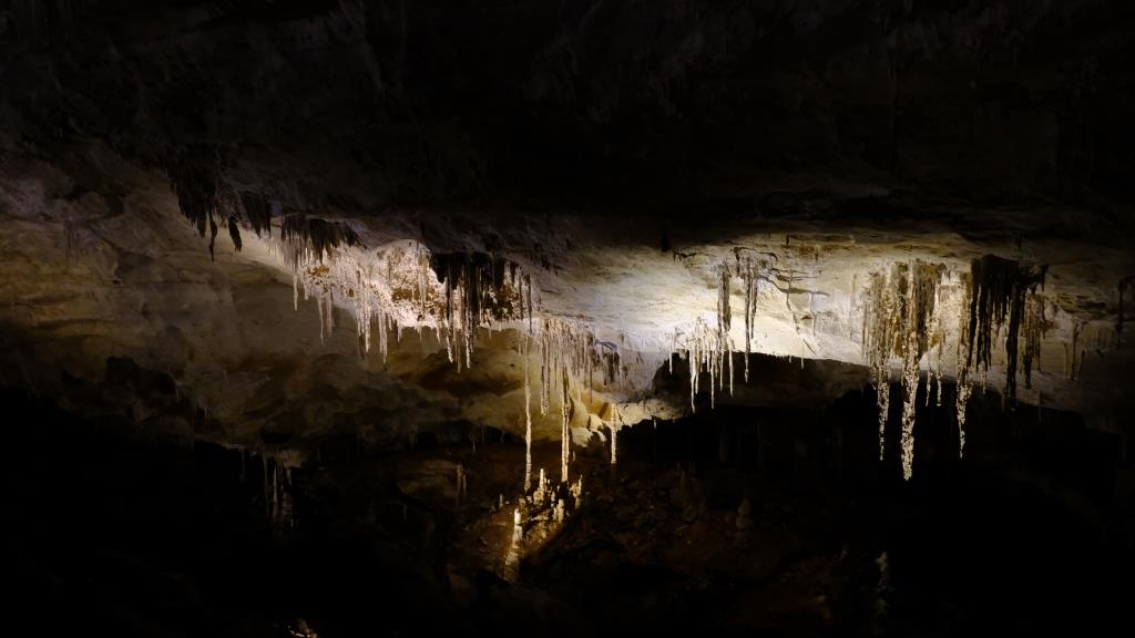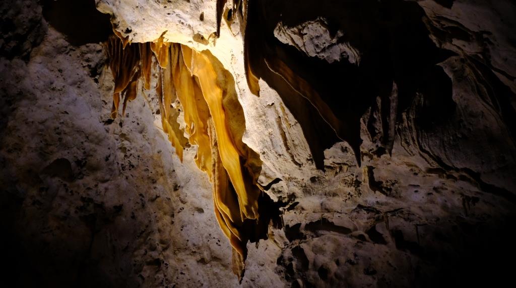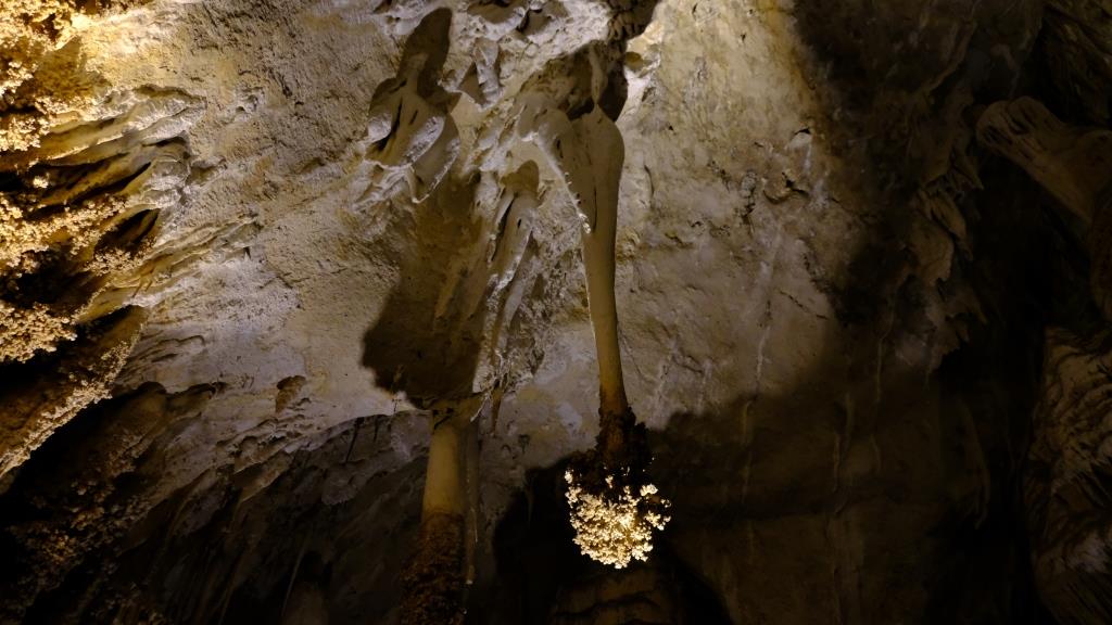 Hier sieht man “schräge” Stalaktiten, denn der große Fels, an dem sie hängen, ist vor langer Zeit abgestürzt.