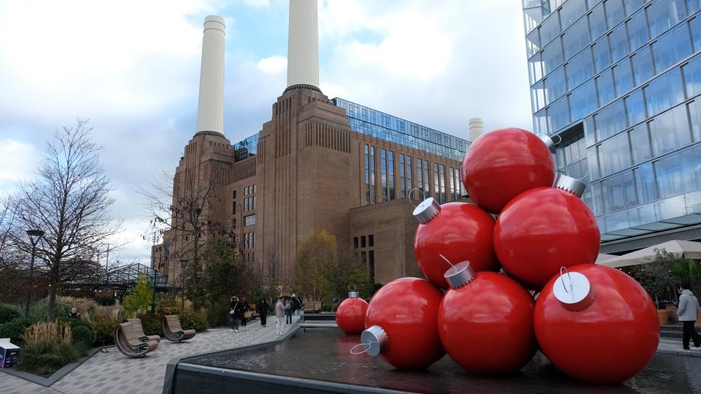 Hinter den Christbaumkugeln seht ihr das ehemalige Kohlekraftwerk „Battersea Power Station“. 10.000 Tonnen Kohle wurden hier mal pro Woche verfeuert!