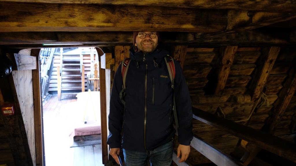 … dann steigen wir ein paar Treppen hoch, außen um einen Schornstein herum.