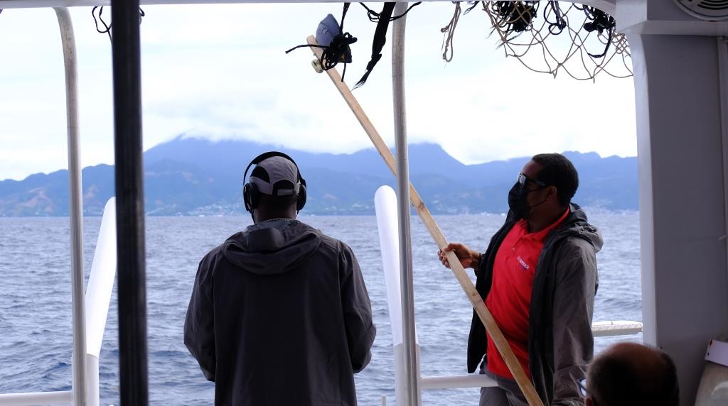 Das nächste Mal, dass wir gehalten haben, war dann schon zum Lauschen. Mit solch einem Sonar hat Francis geprüft, ob die Klicks eines Pottwals zu hören sind.