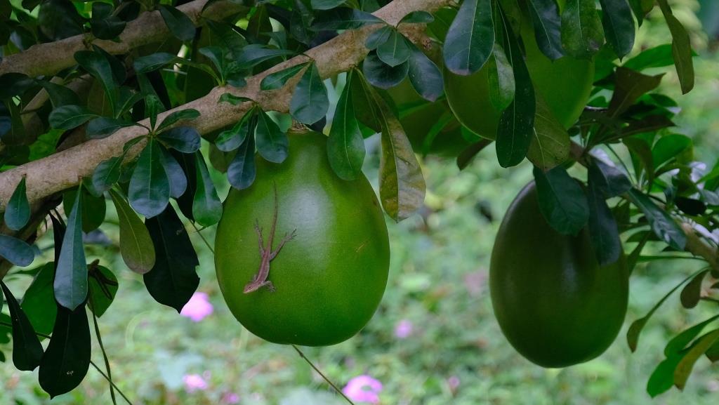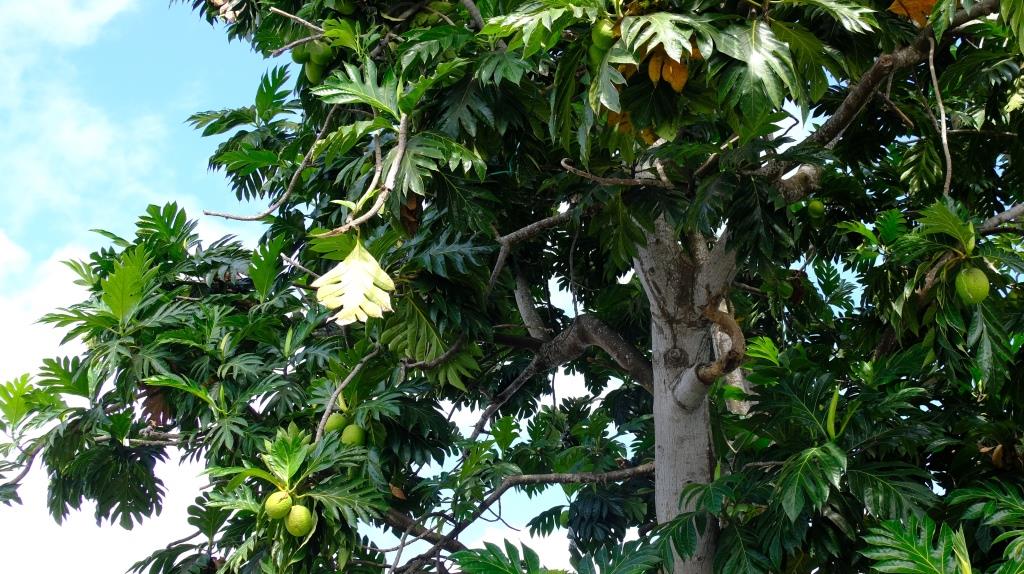 Several times we drove past breadfruit trees. Moira told us about those that captain Bligh had brought them to the island from India, to feed the slaves. It tastes like bread, but is much cheaper … Today this fruit plays a special role in the Dominican cuisine.