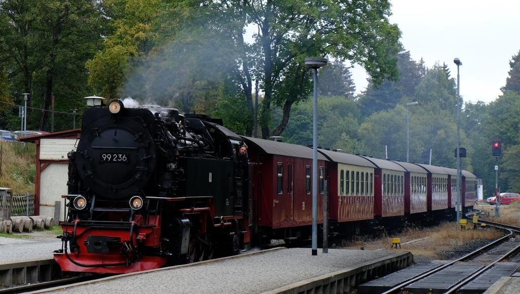 Aber ich konnte mich von unserer schicken Dampflok immer nur für kurze Aufwärmphasen im Waggon losreißen. Diese Strecke, die wir jetzt fahren, der erste Teil, von Drei Annen Hohne nach Schierke, wurde im Juni 1898 eröffnet, und im Oktober ging es dann bis ganz nach oben.