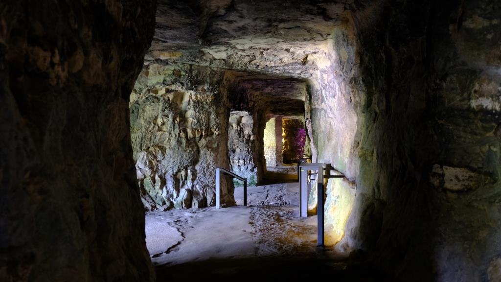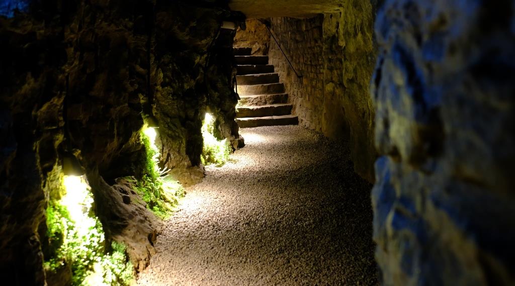 Wir hatten so ein Glück, wir waren nur wir zwei und die beiden jungen Damen, die uns durch den Tunnel geführt haben. Zunächst war der für die Kanalisation gebaut worden, 1961-1963, später auch als Luftschutzraum genutzt. Es gibt hier und da winzige Stalaktiten.