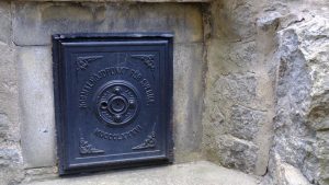 Normalnull ist hier 1900 festgestellt worden. Hinter der Eisentür ist ein senkrechter Silberstab am Stein befestigt, und an dem ist Normalnull eingraviert.