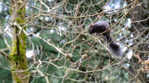 Etliche Eichhörnchen, die auf dürren Zweigen herumbalanciert sind.