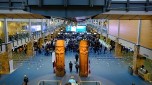 Von Whistler Village aus kann man zwei riesige Ski-Gebiete erreichen (Whistler Mountain und Blackcomb Mountain), die beide mit einer Gondelbahn verbunden sind – der Peak-2-Peak Bahn. Blackcomb Mountain ist ein Gletschergebiet mit vielen schwarzen Pisten, und da das Wetter heute sehr bescheiden war (bedeckt und leichter Schneefall), hab ich mich entschlossen mit Whistler Mountain anzufangen. Also reihte ich mich in die lange Schlange vor der Whistler Village Gondola ein. Aber auch hier ging alles sehr schnell, da die Gondelbahn eine hohe Kapazität hat.